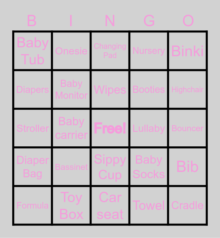 This bingo card has a free space and 24 words: Bassinet, Toy Box, Wipes, Formula, Binki, Baby Tub, Diapers, Onesie, Lullaby, Sippy Cup, Booties, Stroller, Baby Socks, Bib, Baby Monitor, Towel, Bouncer, Changing Pad, Highchair, Baby carrier, Cradle, Diaper Bag, Nursery and Car seat.