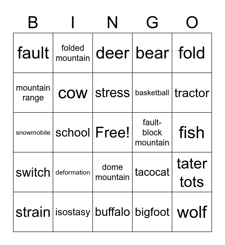 This bingo card has a free space and 24 words: deformation, isostasy, stress, strain, fold, fault, mountain range, folded mountain, fault-block mountain, dome mountain, basketball, snowmobile, tacocat, tater tots, cow, bigfoot, fish, deer, tractor, school, wolf, switch, bear and buffalo.