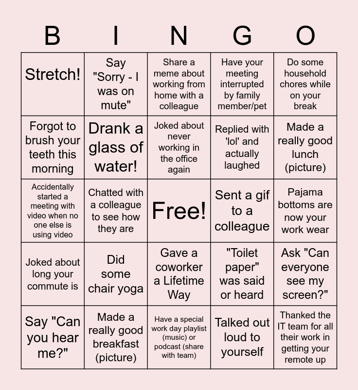 This bingo card has a free space and 24 words: Say "Can you hear me?", Did some chair yoga, Joked about never working in the office again, Talked out loud to yourself, Do some household chores while on your break, Stretch!, Say "Sorry - I was on mute", Share a meme about working from home with a colleague, Sent a gif to a colleague, Pajama bottoms are now your work wear, Accidentally started a meeting with video when no one else is using video, Drank a glass of water!, "Toilet paper" was said or heard, Ask "Can everyone see my screen?", Forgot to brush your teeth this morning, Made a really good breakfast (picture), Have a special work day playlist (music) or podcast (share with team), Have your meeting interrupted by family member/pet, Made a really good lunch (picture), Joked about long your commute is, Chatted with a colleague to see how they are, Gave a coworker a Lifetime Way, Replied with 'lol' and actually laughed and Thanked the IT team for all their work in getting your remote up.