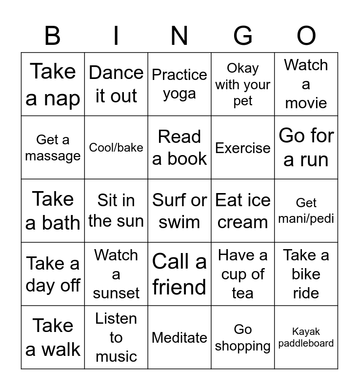 This bingo card has a free space and 24 words: Watch a sunset, Listen to music, Read a book, Take a walk, Watch a movie, Take a nap, Get a massage, Dance it out, Eat ice cream, Call a friend, Exercise, Take a bath, Have a cup of tea, Take a bike ride, Cool/bake, Go shopping, Get mani/pedi, Practice yoga, Go for a run, Sit in the sun, Kayak paddleboard, Take a day off, Okay with your pet and Meditate.