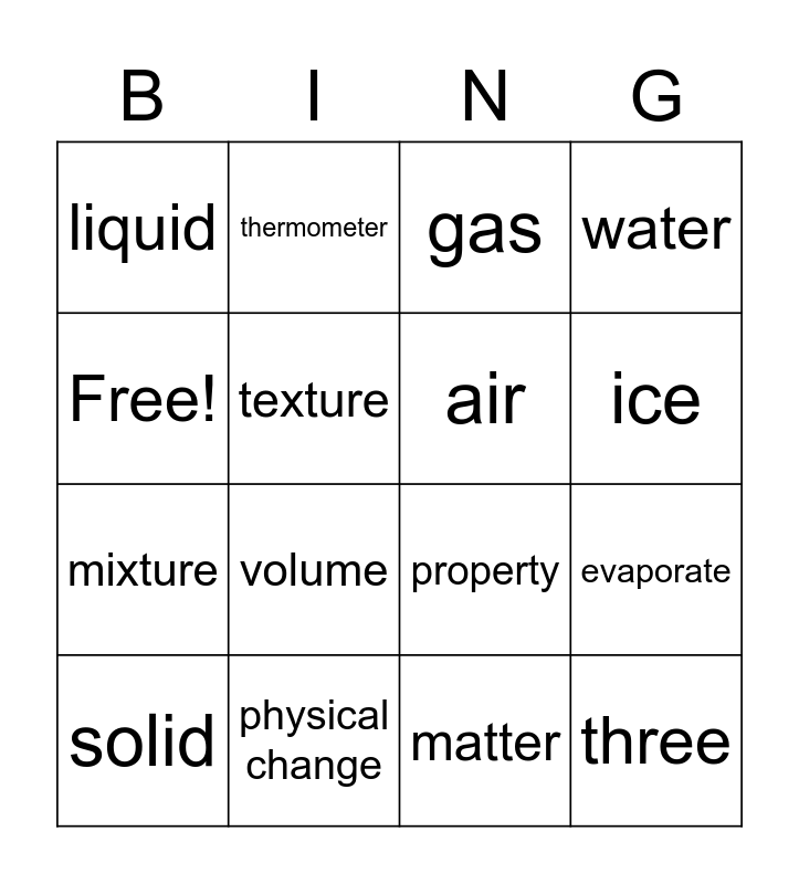 This bingo card has 16 words: physical change, evaporate, gas, liquid, mixture, thermometer, property, matter, Free!, texture, solid, water, volume, ice, air and three.
