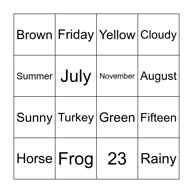 This bingo card has 22 words: Frog, Sunday, Friday, Tuesday, July, November, Brown, Yellow, Green, Rainy, Sunny, Cloudy, Fish, Santa Claus, 23, 100, Fifteen, Horse, Turkey, Summer, August and Christmas Tree.