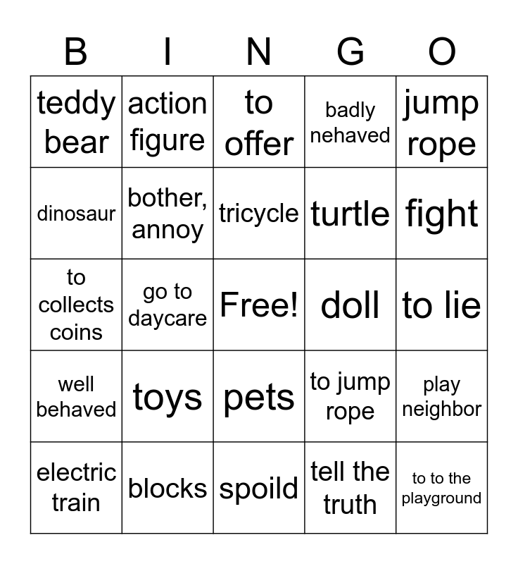 This bingo card has a free space and 24 words: toys, blocks, tricycle, electric train, jump rope, teddy bear, dinosaur, action figure, doll, pets, turtle, to collects coins, to jump rope, play neighbor, bother, annoy, tell the truth, to lie, to offer, fight, go to daycare, to to the playground, well behaved, badly nehaved and spoild.