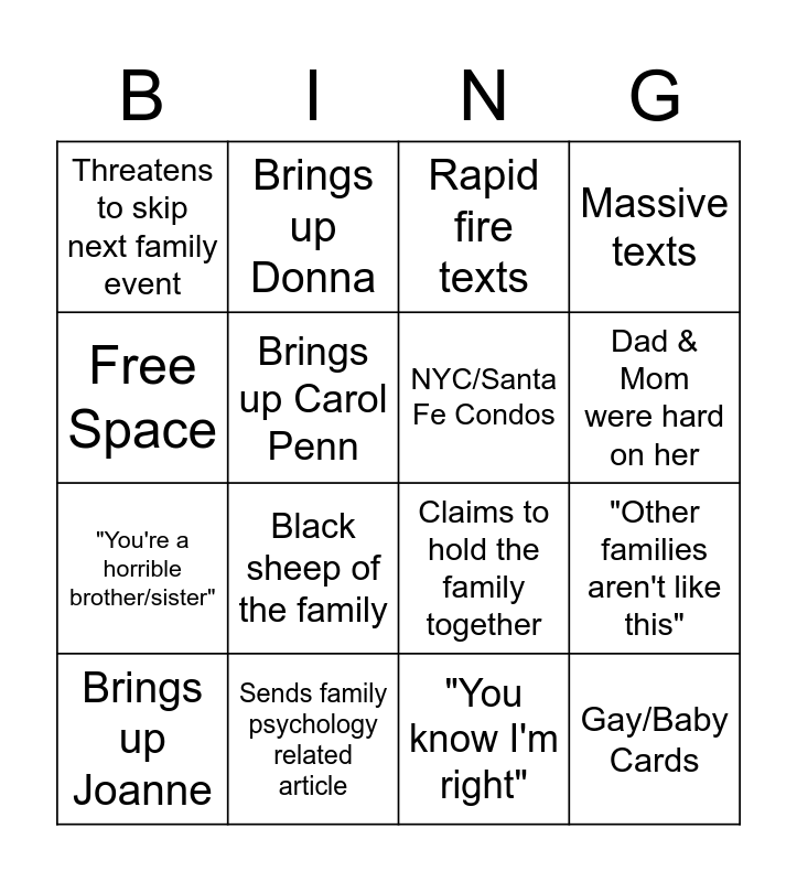 This bingo card has 16 words: Sends family psychology related article, "Other families aren't like this", Rapid fire texts, Threatens to skip next family event, "You're a horrible brother/sister", Brings up Donna, Claims to hold the family together, "You know I'm right", Free Space, Brings up Carol Penn, Brings up Joanne, Massive texts, Black sheep of the family, Dad & Mom were hard on her, NYC/Santa Fe Condos and Gay/Baby Cards.
