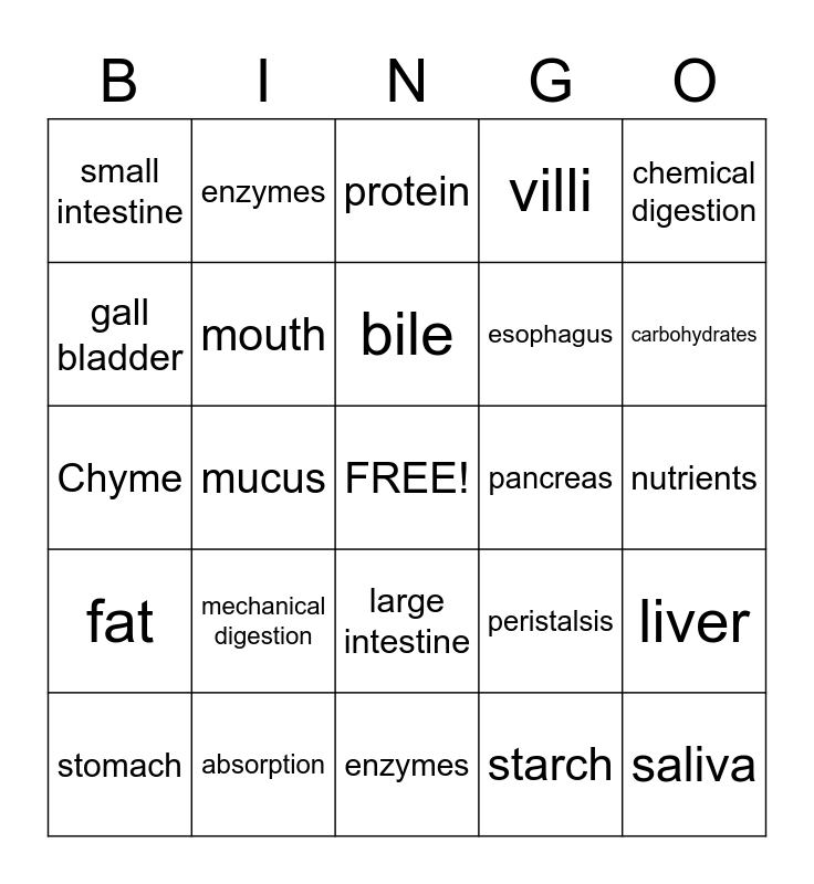 This bingo card has a free space and 24 words: mechanical digestion, absorption, bile, stomach, chemical digestion, small intestine, gall bladder, enzymes, pancreas, large intestine, esophagus, Chyme, peristalsis, liver, mouth, starch, nutrients, protein, carbohydrates, mucus, saliva, fat, villi and enzymes.