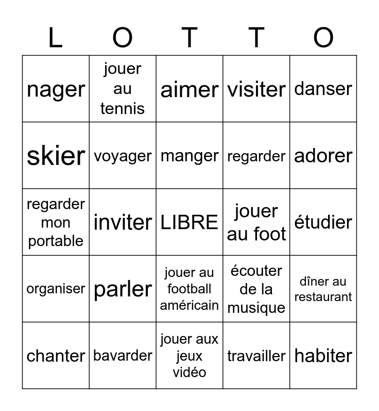 This bingo card has a free space and 24 words: parler, bavarder, manger, chanter, danser, nager, skier, jouer au tennis, jouer au foot, jouer au football américain, regarder, regarder mon portable, écouter de la musique, dîner au restaurant, voyager, travailler, étudier, aimer, adorer, inviter, habiter, organiser, visiter and jouer aux jeux vidéo.