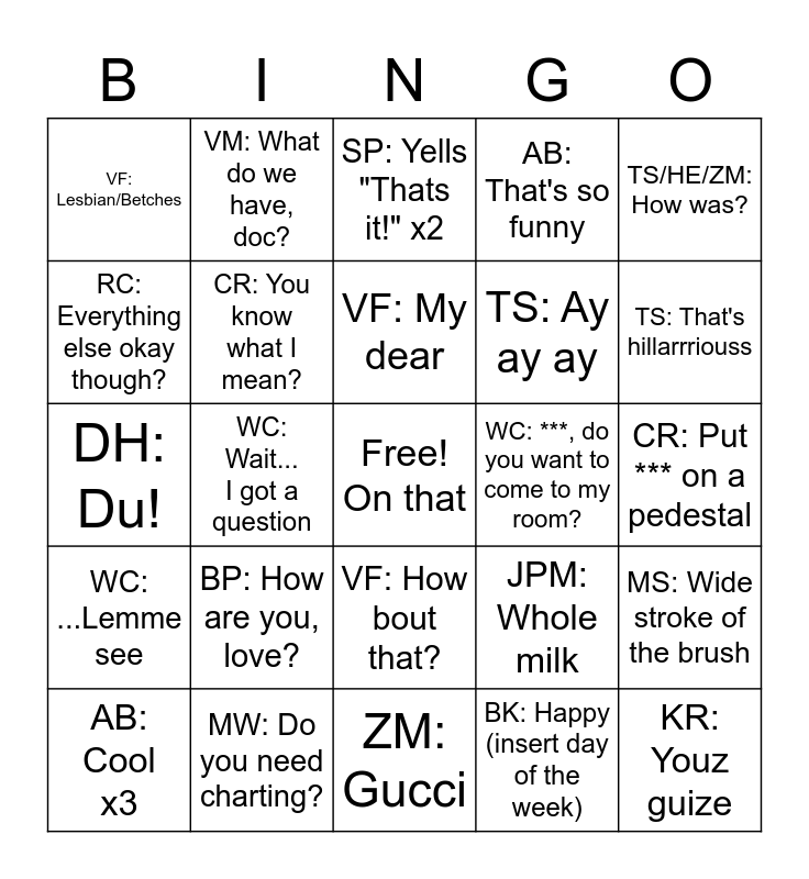 This bingo card has a free space and 31 words: ZM: Gucci, VF: Dead body, WC: Wait... I got a question, Ari: Who's on phone triage?, VF: Lesbian/Betches, SP: Yells "Thats it!" x2, CR: You know what I mean?, JPM: Whole milk, WC: ***, do you want to come to my room?, BK: Happy (insert day of the week), CR: Put *** on a pedestal, KR: Youz guize, MC: LOVE, AB: I hear you, TS: That's hillarrriouss, MC: Poke my eyes out, MS: Wide stroke of the brush, BP: How are you, love?, WC: ...Lemme see, VF: How bout that?, TS/HE/ZM: How was?, MU: Just saying, AB: Cool x3, VM: What do we have, doc?, TS: Ay ay ay, RC: Everything else okay though?, AB: That's so funny, DH: Du!, MW: Do you need charting?, VF: My dear and MS: It's always something.