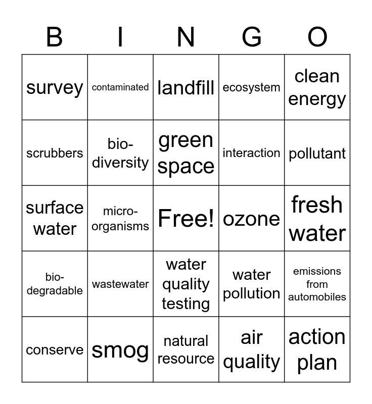 This bingo card has a free space and 34 words: air pollution, air quality, algal bloom, bacteria, bio- degradable, bio-diversity, clean energy, conserve, contaminated, crop rotation, green space, landfill, ground water, no-till farming, ozone, pollutant, smog, surface water, wastewater, water pollution, water quality testing, water treatment plant, survey, fresh water, natural resource, action plan, ecosystem, disinfection, interaction, scrubbers, urban gardens, micro-organisms, emissions from automobiles and air quality index.