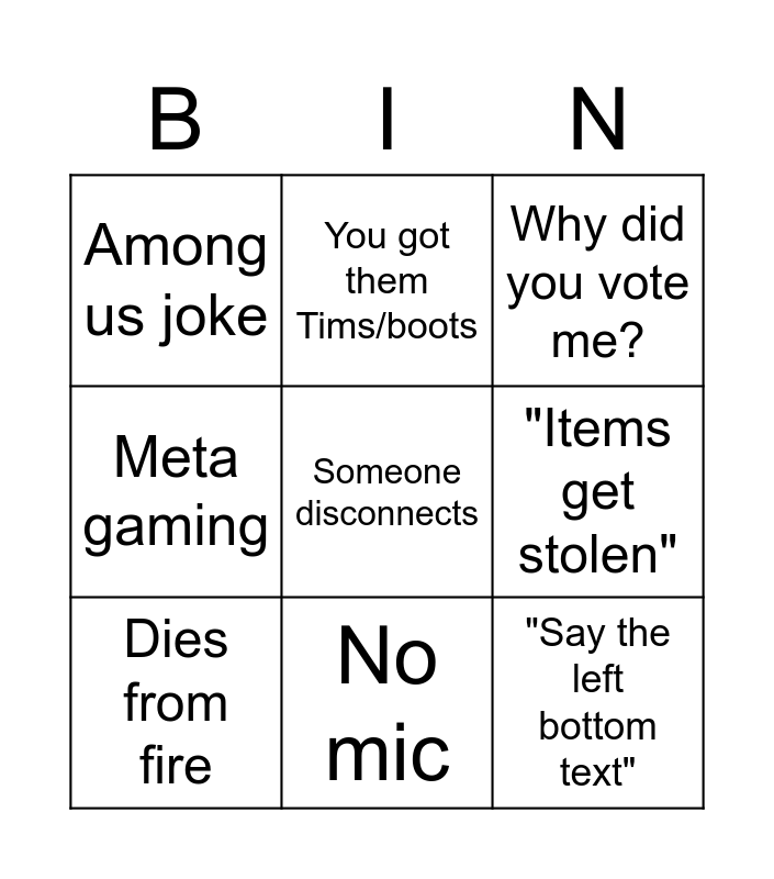 This bingo card has 16 words: Where you get that "clothes", Why you push me?, Why did you vote me?, Among us joke, "Say the left bottom text", You got them Tims/boots, Die by the Personoid, Kill the Personoid, Someone disconnects, "Items get stolen", T bagged, Meta gaming, "Not knowing pc symbol nicknames", No mic, Dies from fire and "cheese strats".