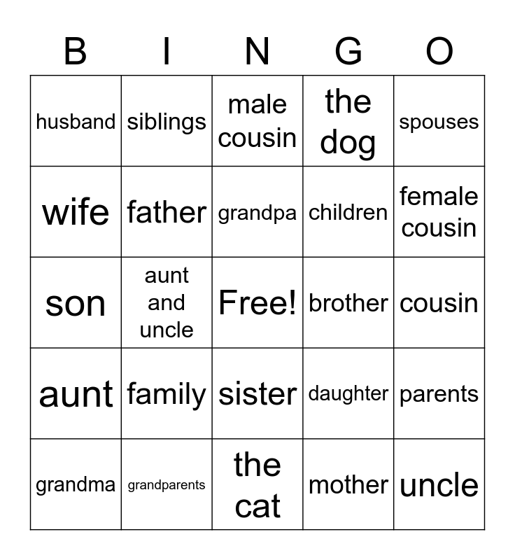 This bingo card has a free space and 24 words: family, grandparents, grandpa, grandma, spouses, husband, wife, siblings, brother, sister, children, son, daughter, parents, father, mother, cousin, male cousin, female cousin, aunt and uncle, uncle, aunt, the dog and the cat.