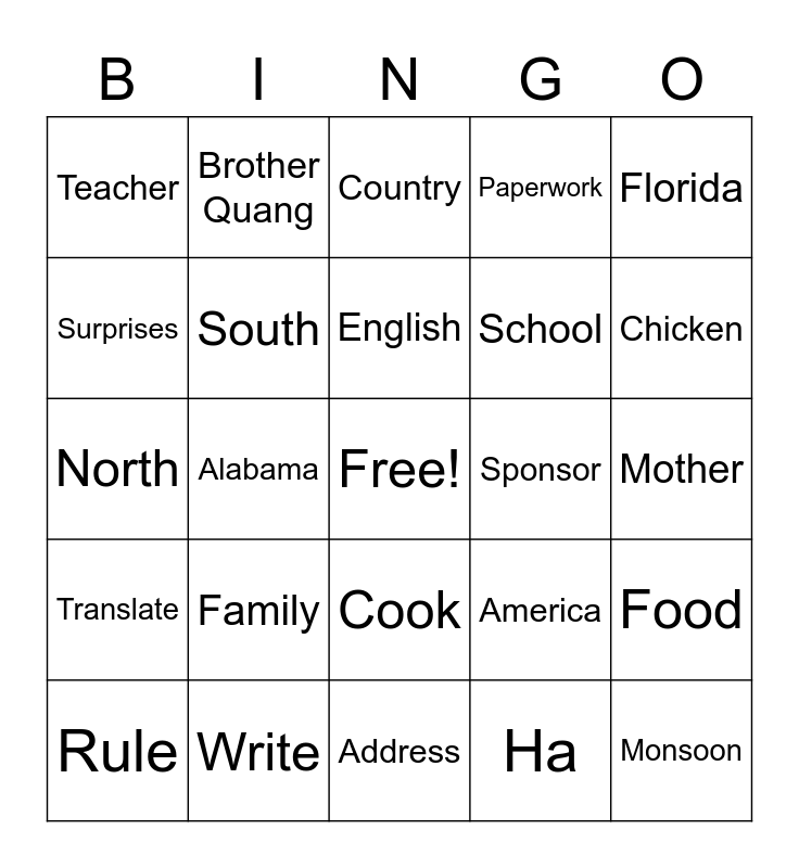 This bingo card has a free space and 32 words: Ha, Scold, Alabama, Father, Translate, South, Florida, Food, Brother Quang, Pity, English, Country, Exception, Cowboy, Sponsor, Brother Vu, Rule, North, Cook, Family, America, Home, Mother, Write, Monsoon, Paperwork, School, Surprises, Teacher, Address, Grateful and Chicken.