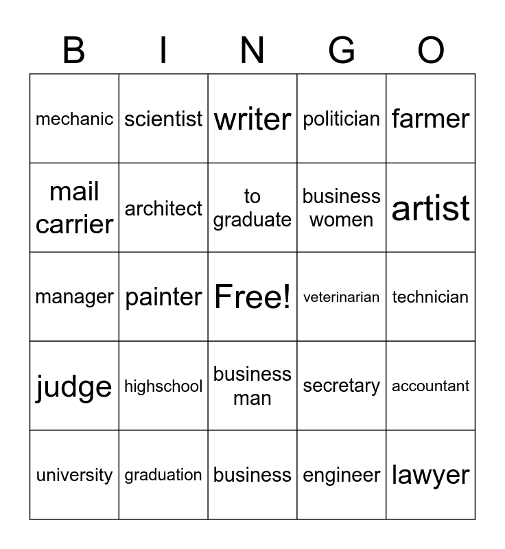 This bingo card has a free space and 24 words: highschool, graduation, to graduate, university, farmer, mechanic, mail carrier, scientist, veterinarian, business man, business women, manager, secretary, accountant, architect, engineer, technician, writer, artist, painter, lawyer, judge, politician and business.