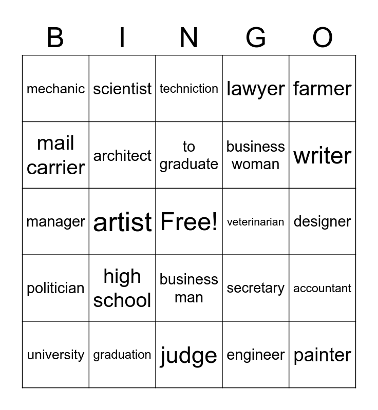 This bingo card has a free space and 24 words: high school, graduation, to graduate, university, farmer, mechanic, mail carrier, scientist, veterinarian, business man, business woman, manager, secretary, accountant, architect, engineer, designer, techniction, writer, artist, painter, politician, lawyer and judge.