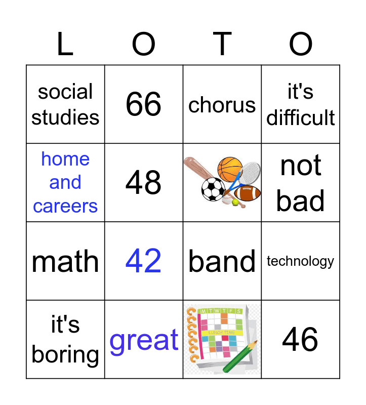 This bingo card has 7 images and 41 words: 54, it's boring, it's interesting, 70, break time, 66, it's easy, 48, good grades, it's difficult, Health, 39, I'm strong, not bad, great, bad grades, home and careers, technology, I don't care, social studies, math, 42, 47, 64, 51, 46, 71, 68, 37, 55, 52, 67, 65, it's fun, english, chorus, orchestra, band, study hall, 61 and it's useful.