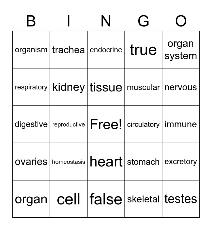 This bingo card has a free space and 24 words: homeostasis, cell, tissue, organ, organ system, organism, respiratory, trachea, circulatory, heart, muscular, digestive, stomach, excretory, kidney, skeletal, immune, endocrine, nervous, reproductive, testes, ovaries, true and false.