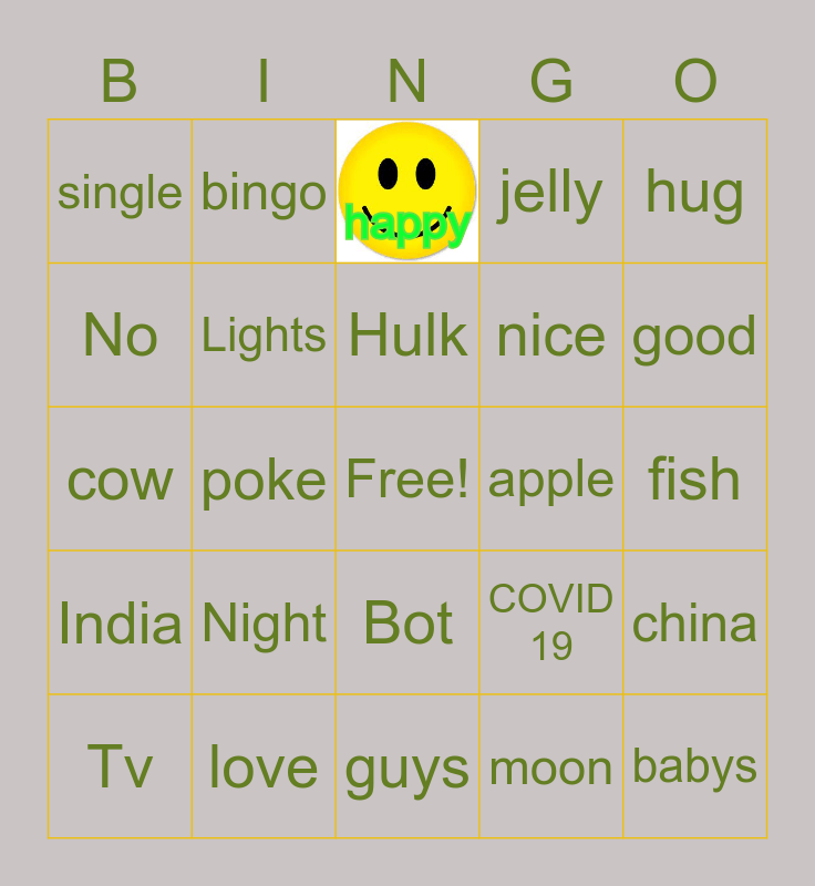 This bingo card has 2 images, a free space and 44 words: cocomelon, babys, iPhone, Tv, lamp, moon, happy, clock, hug, love, jelly, apple, Bot, Night, more, guys, pink, cow, dog, good, bingo, baker, sus, single, banana, fish, 2022, mouse, COVID 19, India, farm, china, falling, paw, poke, boys, Batman, Superman, Hulk, No, nice, GRID, Lights and Sound.