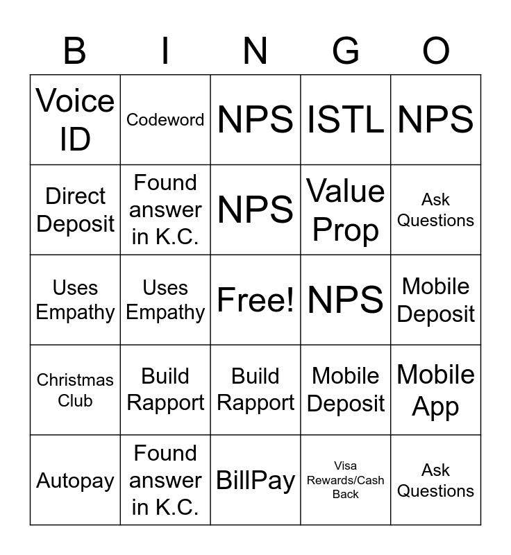 This bingo card has a free space and 48 words: Alerts, Ask Questions, Autopay, BillPay, Build Rapport, Christmas Club, Codeword, Contact Help Desk, Direct Deposit, E-Statement, Found answer in K.C., ISTL, Mobile App, Mobile Deposit, Money Market, MyExpress, NPS, NPS, NPS, NPS, Uses Empathy, Visa Rewards/Cash Back, Voice ID, Value Prop, Alerts, Ask Questions, Autopay, BillPay, Build Rapport, Christmas Club, Codeword, Contact Help Desk, Direct Deposit, E-Statement, Found answer in K.C., ISTL, Mobile App, Mobile Deposit, Money Market, MyExpress, NPS, NPS, NPS, NPS, Uses Empathy, Visa Rewards/Cash Back, Voice ID and Value Prop.