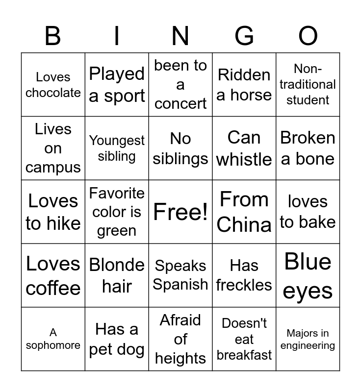 This bingo card has a free space and 24 words: Blonde hair, Has a pet dog, No siblings, A sophomore, Non-traditional student, Loves chocolate, Lives on campus, Played a sport, From China, Speaks Spanish, Can whistle, Loves to hike, Has freckles, Blue eyes, Youngest sibling, Doesn't eat breakfast, loves to bake, been to a concert, Broken a bone, Favorite color is green, Majors in engineering, Loves coffee, Ridden a horse and Afraid of heights.