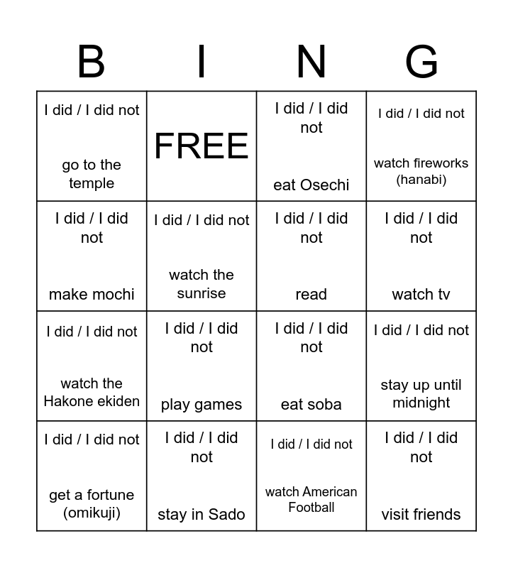This bingo card has 16 words: I did / I did not stay in Sado, I did / I did not stay up until midnight, I did / I did not eat Osechi, I did / I did not go to the temple, I did / I did not watch the Hakone ekiden, FREE, I did / I did not eat soba, I did / I did not watch American Football, I did / I did not make mochi, I did / I did not watch the sunrise, I did / I did not get a fortune (omikuji), I did / I did not watch fireworks (hanabi), I did / I did not play games, I did / I did not watch tv, I did / I did not read and I did / I did not visit friends.