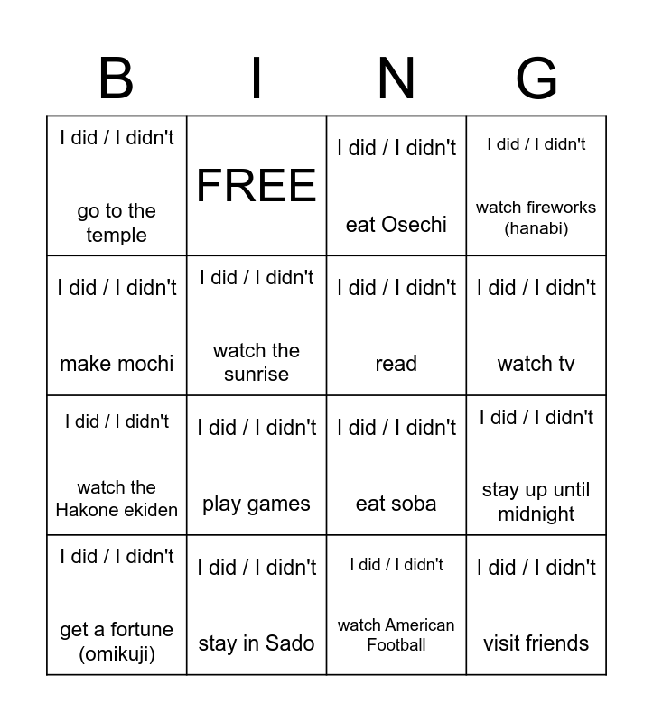 This bingo card has 16 words: I did / I didn't stay in Sado, I did / I didn't stay up until midnight, I did / I didn't eat Osechi, I did / I didn't go to the temple, I did / I didn't watch the Hakone ekiden, FREE, I did / I didn't eat soba, I did / I didn't watch American Football, I did / I didn't make mochi, I did / I didn't watch the sunrise, I did / I didn't get a fortune (omikuji), I did / I didn't watch fireworks (hanabi), I did / I didn't play games, I did / I didn't watch tv, I did / I didn't read and I did / I didn't visit friends.