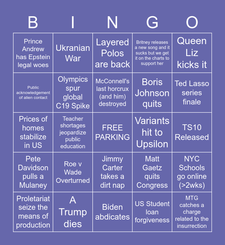 This bingo card has a free space and 24 words: Proletariat seize the means of production, Roe v Wade Overturned, McConnell's last horcrux (and him) destroyed, US Student loan forgiveness, Queen Liz kicks it, Prince Andrew has Epstein legal woes, Ukranian War, Layered Polos are back, Variants hit to Upsilon, TS10 Released, Prices of homes stabilize in US, Olympics spur global C19 Spike, Matt Gaetz quits Congress, NYC Schools go online (>2wks), Public acknowledgement of alien contact, A Trump dies, Biden abdicates, Britney releases a new song and it sucks but we get it on the charts to support her, Ted Lasso series finale, Pete Davidson pulls a Mulaney, Teacher shortages jeopardize public education, Jimmy Carter takes a dirt nap, Boris Johnson quits and MTG catches a charge related to the insurrection.