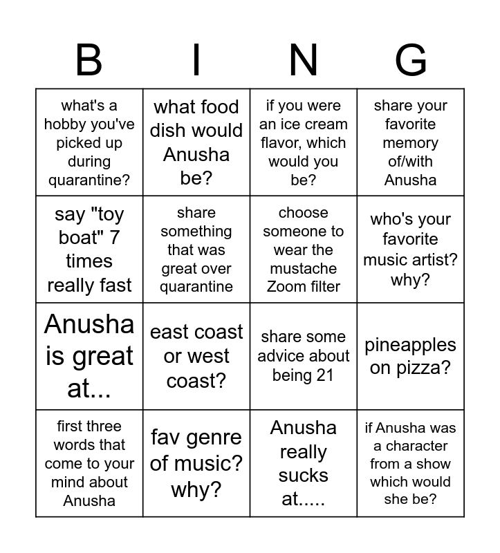 This bingo card has 35 words: share something that sucked over quarantine, share your first impression of Anusha, share how you met Anusha, choose someone to wear the mustache Zoom filter, tell your best joke/pun, share your favorite memory of/with Anusha, share something that was great over quarantine, make your best roast of Anusha, who's your favorite music artist? why?, sing a song that reminds of you Anusha, share some advice about being 21, say "toy boat" 7 times really fast, share your favorite thing about Anusha, mountains or the beach and why?, what's a hobby you've picked up during quarantine?, fav genre of music? why?, do you prefer the beach or the mountains? and why?, pineapples on pizza?, if Anusha was a character from a show which would she be?, first three words that come to your mind about Anusha, rap or pop music?, talk about a show you've binged, small town or big city?, one thing you think Anusha can’t live without, if you were an ice cream flavor, which would you be?, east coast or west coast?, what are you looking forward to most in 2022?, if you could go on your dream vacation, where would you go?, Anusha is great at..., Anusha really sucks at....., cereal or milk first?, Free Space!, Free Space!, what food dish would Anusha be? and bubble tea or Starbucks?.