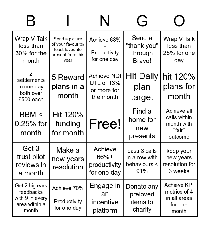 This bingo card has a free space and 24 words: Make a new years resolution, Achieve 70% + Productivity for one day, Achieve NDI UTL of 13% or more for the month, Get 2 big ears feedbacks with 9 in every area within a month, Wrap V Talk less than 25% for one day, Wrap V Talk less than 30% for the month, 2 settlements in one day both over £500 each, Send a picture of your favourite/ least favourite present from this year, Find a home for new presents, Achieve 66%+ productivity for one day, Hit Daily plan target, RBM < 0.25% for month, pass 3 calls in a row with behaviours < 91%, keep your new years resolution for 3 weeks, 5 Reward plans in a month, Donate any preloved items to charity, Achieve all calls within month with "fair" outcome, Achieve 63% + Productivity for one day, hit 120% plans for month, Hit 120% funding for month, Achieve KPI metrics of 4 in all areas for one month, Get 3 trust pilot reviews in a month, Send a "thank you" through Bravo! and Engage in an incentive platform.