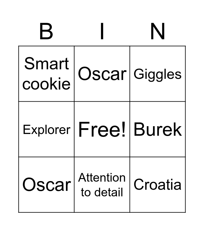 This bingo card has a free space and 39 words: "Look at him, the little ba***rd" :D, Helpful, Quiz champion, Oscar, Dry wit, Hard to replace, Attention to detail, Hiking, Croatia, Avocados, OG SAP Team, Explorer, Hard to replace, Dry wit, Encyclopedia, We will miss you!, Attention to detail, Smart cookie, Mammy's cooking, "Look at him, the little ba***rd" :D, Burek, Hrvoje, PINK, On Wednesday's we wear pink, I THINK I FINALLY HAVE POST APPROVAL ACCESS!, Stay in touch!, Giant Jenga, Thank you Maja!, Makovnjaca, Oscar, Hiking, Christmas Party Photoshoot, Giggles, Supportive, MSD Dunboyne, Cats, Stealing the neighbour's cats…, Helpful and Quiz champion.