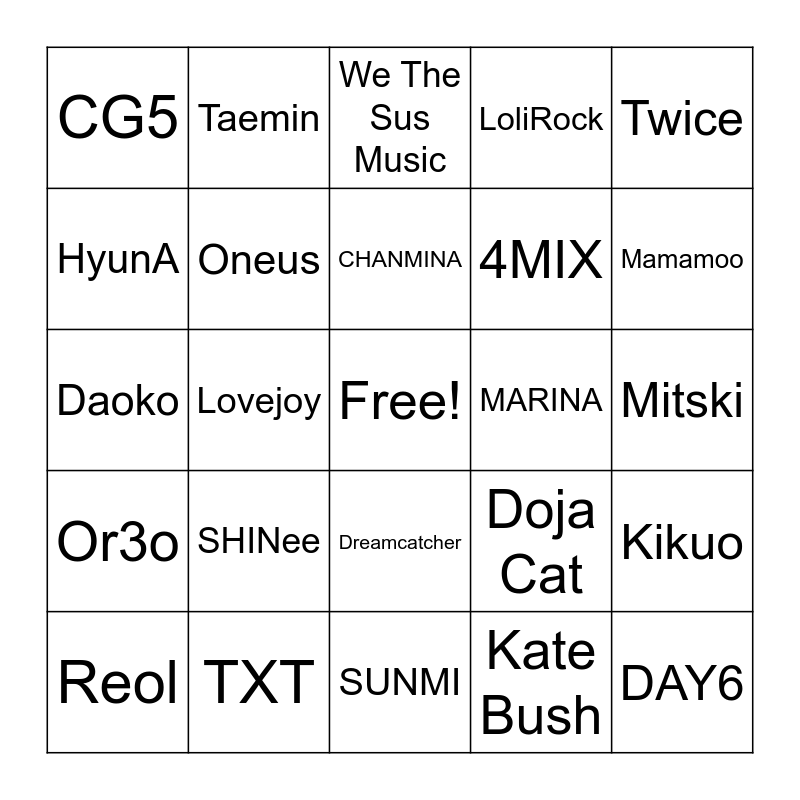 This bingo card has a free space and 24 words: Reol, SHINee, CHANMINA, Kate Bush, Twice, CG5, Taemin, We The Sus Music, MARINA, Mitski, Daoko, Oneus, Doja Cat, Kikuo, HyunA, TXT, SUNMI, LoliRock, Mamamoo, Or3o, Lovejoy, Dreamcatcher, 4MIX and DAY6.