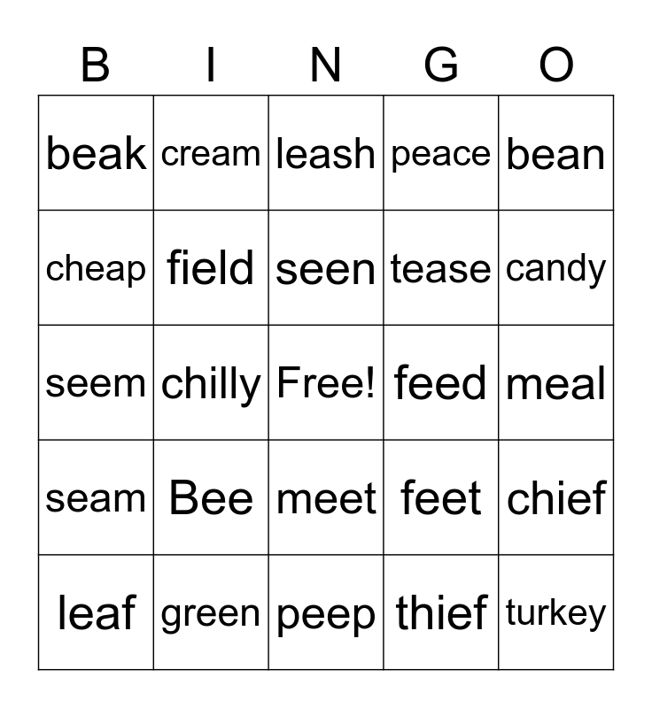 This bingo card has a free space and 24 words: Bee, green, seen, leaf, bean, beak, cheap, cream, feed, meet, tease, seem, feet, chief, field, thief, meal, leash, candy, chilly, turkey, seam, peace and peep.