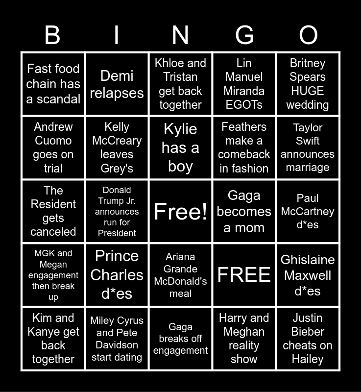This bingo card has a free space and 25 words: Prince Charles d*es, Gaga breaks off engagement, Kylie has a boy, Kim and Kanye get back together, Britney Spears HUGE wedding, Fast food chain has a scandal, Andrew Cuomo goes on trial, Demi relapses, Gaga becomes a mom, Ariana Grande McDonald's meal, Feathers make a comeback in fashion, The Resident gets canceled, FREE, Ghislaine Maxwell d*es, Kelly McCreary leaves Grey's, I meet Gaga, Paul McCartney d*es, Khloe and Tristan get back together, Taylor Swift announces marriage, Donald Trump Jr. announces run for President, Justin Bieber cheats on Hailey, Miley Cyrus and Pete Davidson start dating, MGK and Megan engagement then break up, Lin Manuel Miranda EGOTs and Harry and Meghan reality show.