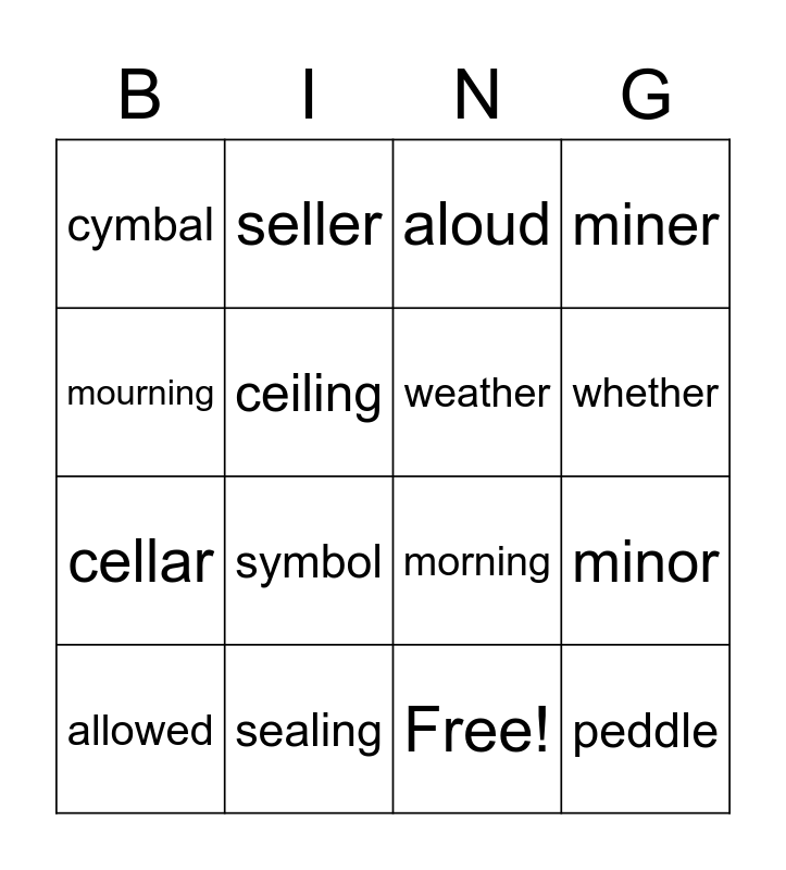 This bingo card has 17 words: Free!, allowed, aloud, cymbal, symbol, miner, minor, weather, whether, ceiling, sealing, morning, mourning, seller, cellar, pedal and peddle.