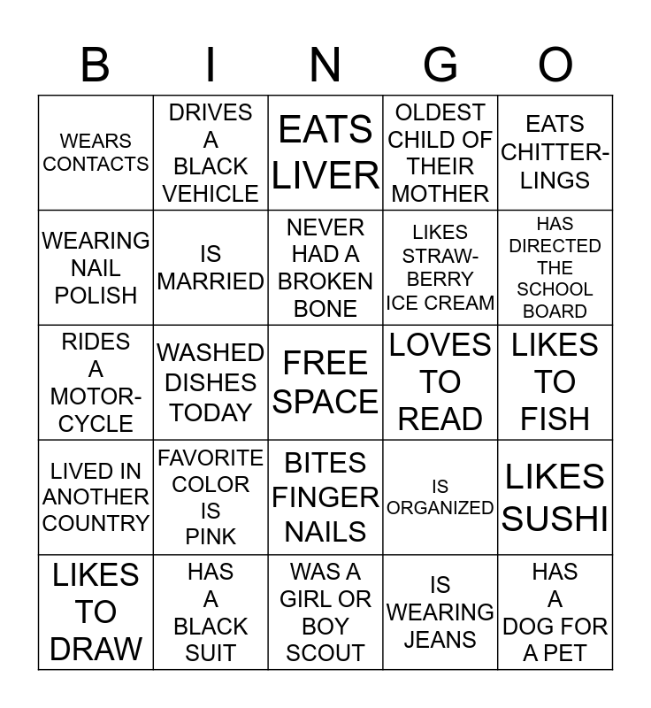 This bingo card has a free space and 24 words: FAVORITE COLOR IS PINK, HAS A BLACK SUIT, NEVER HAD A BROKEN BONE, LIKES TO DRAW, EATS CHITTER-LINGS, WEARS CONTACTS, WEARING NAIL POLISH, DRIVES A BLACK VEHICLE, LOVES TO READ, BITES FINGER NAILS, LIKES STRAW-BERRY ICE CREAM, RIDES A MOTOR-CYCLE, IS ORGANIZED, LIKES SUSHI, IS MARRIED, IS WEARING JEANS, LIKES TO FISH, EATS LIVER, HAS DIRECTED THE SCHOOL BOARD, WASHED DISHES TODAY, HAS A DOG FOR A PET, LIVED IN ANOTHER COUNTRY, OLDEST CHILD OF THEIR MOTHER and WAS A GIRL OR BOY SCOUT.