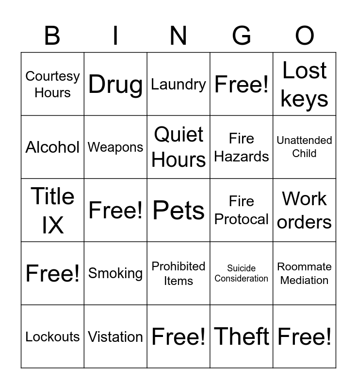 This bingo card has a free space and 24 words: Smoking, Vistation, Quiet Hours, Lockouts, Lost keys, Courtesy Hours, Alcohol, Drug, Fire Protocal, Prohibited Items, Fire Hazards, Title IX, Suicide Consideration, Roommate Mediation, Weapons, Theft, Work orders, Laundry, Unattended Child, Free!, Free!, Free!, Free! and Free!.