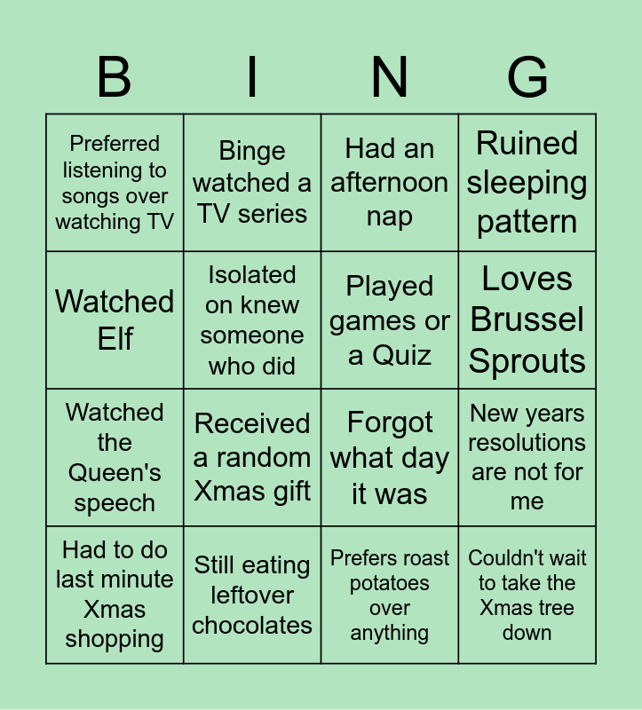 This bingo card has 16 words: Still eating leftover chocolates, New years resolutions are not for me, Had an afternoon nap, Preferred listening to songs over watching TV, Watched the Queen's speech, Binge watched a TV series, Forgot what day it was, Prefers roast potatoes over anything, Watched Elf, Isolated on knew someone who did, Had to do last minute Xmas shopping, Ruined sleeping pattern, Received a random Xmas gift, Loves Brussel Sprouts, Played games or a Quiz and Couldn't wait to take the Xmas tree down.
