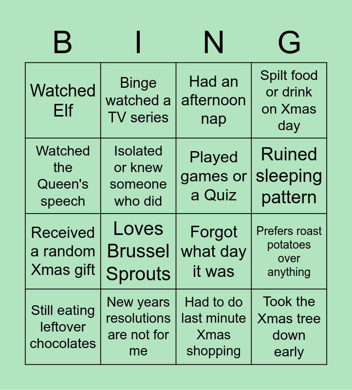 This bingo card has 16 words: Still eating leftover chocolates, New years resolutions are not for me, Had an afternoon nap, Spilt food or drink on Xmas day, Watched the Queen's speech, Binge watched a TV series, Forgot what day it was, Prefers roast potatoes over anything, Watched Elf, Isolated or knew someone who did, Had to do last minute Xmas shopping, Ruined sleeping pattern, Received a random Xmas gift, Loves Brussel Sprouts, Played games or a Quiz and Took the Xmas tree down early.