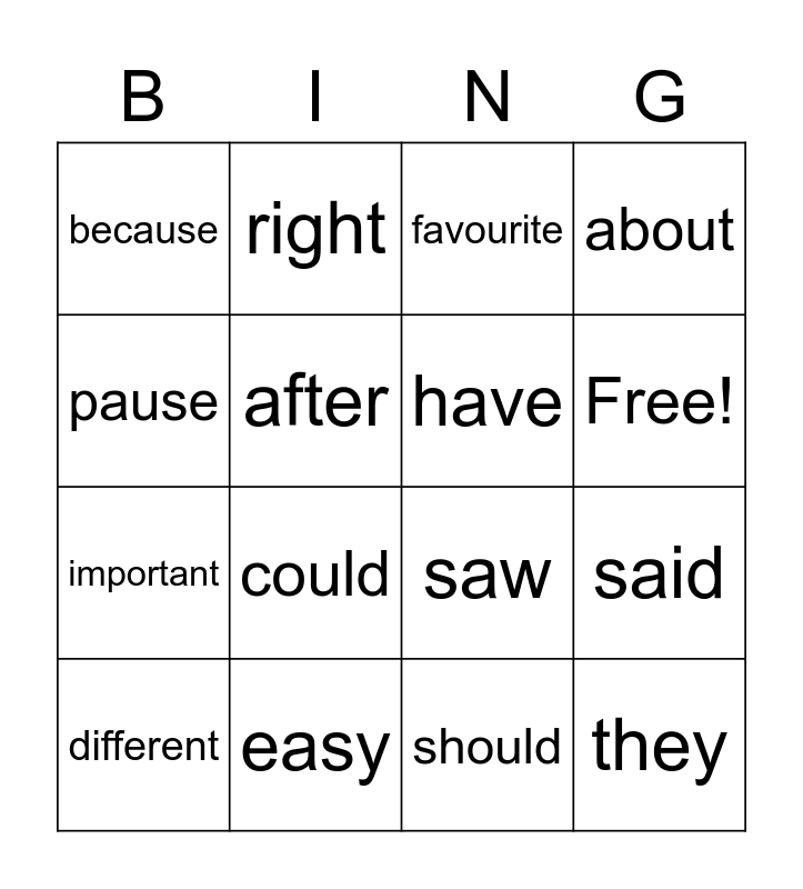 This bingo card has 18 words: could, they, favourite, because, saw, about, different, right, Free!, important, should, pause, said, after, have, easy, easy and people.
