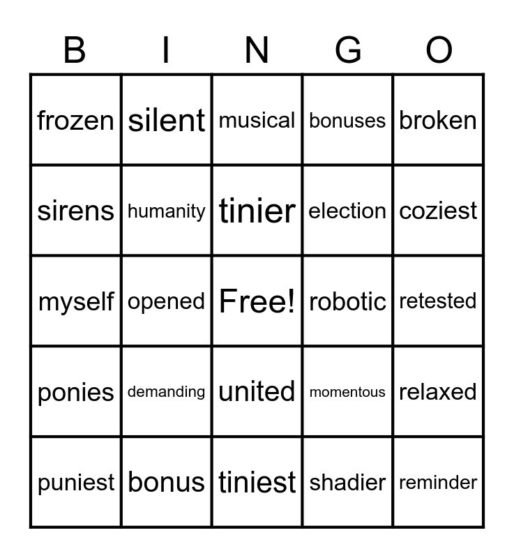 This bingo card has a free space and 24 words: demanding, bonus, tinier, puniest, broken, frozen, sirens, silent, robotic, united, election, myself, momentous, relaxed, humanity, shadier, retested, musical, coziest, opened, reminder, ponies, bonuses and tiniest.
