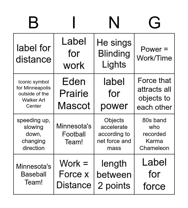 This bingo card has 24 words: the force acting over a distance, A push or a pull, length between 2 points, Label for force, label for distance, Label for work, label for power, Power = Work/Time, speeding up, slowing down, changing direction, Work = Force x Distance, rate at which work is done, Force that attracts all objects to each other, force that opposes motion and slows all objects down, Objects in motion want to stay in motion and at rest want to stay at rest, Objects accelerate according to net force and mass, Objects exert equal and opposite forces on each other, Minnesota's Baseball Team!, Eden Prairie Mascot, style of animation originating in Japan that is characterized by stark colorful graphics, 80s band who recorded Karma Chameleon, Iconic symbol for Minneapolis outside of the Walker Art Center, Minnesota's Football Team!, He sings Blinding Lights and City directly to the north of Eden Prairie.