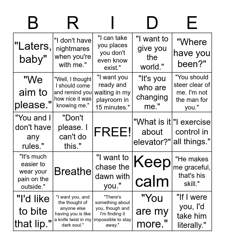 This bingo card has a free space and 24 words: Breathe, "I want you, and the thought of anyone else having you is like a knife twist in my dark soul.", "I want you ready and waiting in my playroom in 15 minutes.", "I'd like to bite that lip.", "Where have you been?", "Laters, baby", "We aim to please.", "I don't have nightmares when you're with me.", "What is it about elevator?", "I want to chase the dawn with you.", "It's you who are changing me.", "You and I don't have any rules.", Keep calm, "He makes me graceful, that's his skill.", "Well, I thought I should come and remind you how nice it was knowing me.", "You are my more.", "I exercise control in all things.", "I can take you places you don't even know exist.", "You should steer clear of me. I'm not the man for you.", "Don't please. I can't do this.", "If I were you, I'd take him literally.", "It's much easier to wear your pain on the outside.", "I want to give you the world." and "There's something about you, though and I'm finding it impossible to stay away.".