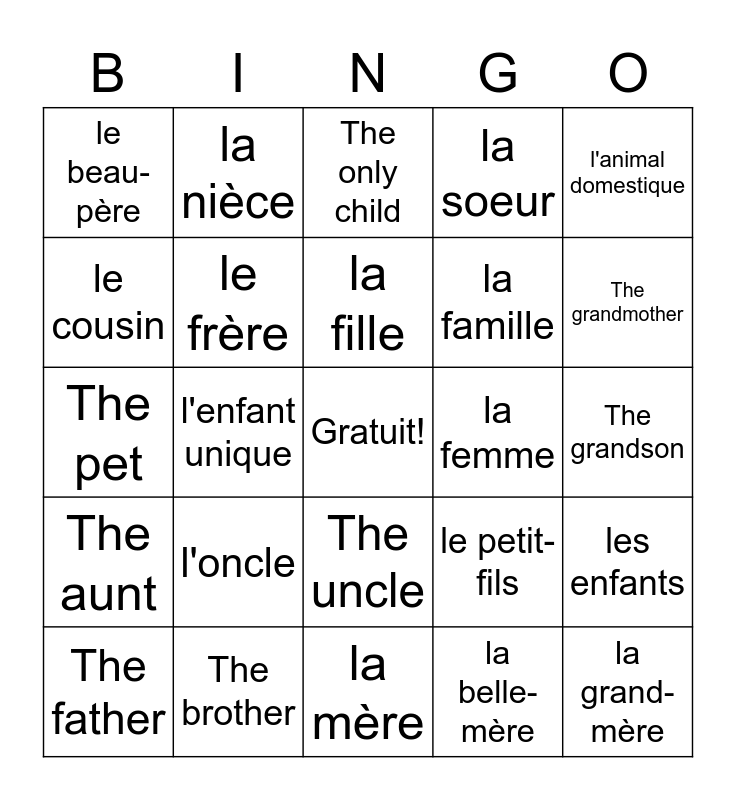 This bingo card has a free space and 49 words: le grand-père, la grand-mère, le père, la mère, l'oncle, la tante, la nièce, le neveu, le cousin, la cousine, le frère, la soeur, les enfants, le petit-fils, la petite-fille, le fils, la fille, la femme, le mari, l'animal domestique, l'enfant unique, la belle-mère, le beau-père, la famille, The grandfather, The grandmother, The father, The mother, The uncle, The aunt, The niece, The nephew, The male cousin, The female cousin, The brother, The sister, Free, The children, The grandson, The granddaughter, The son, The daughter, The wife, The husband, The pet, The only child, The stepmother, The stepfather and The family.