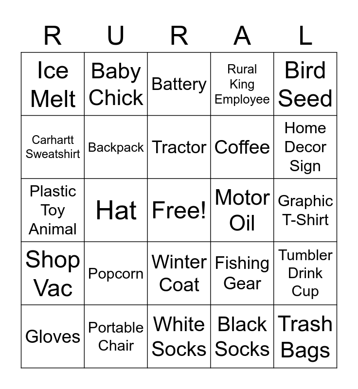 This bingo card has a free space and 24 words: Popcorn, Portable Chair, Tractor, Gloves, Bird Seed, Ice Melt, Carhartt Sweatshirt, Baby Chick, Motor Oil, Winter Coat, Coffee, Plastic Toy Animal, Fishing Gear, Tumbler Drink Cup, Backpack, Black Socks, Graphic T-Shirt, Battery, Home Decor Sign, Hat, Trash Bags, Shop Vac, Rural King Employee and White Socks.