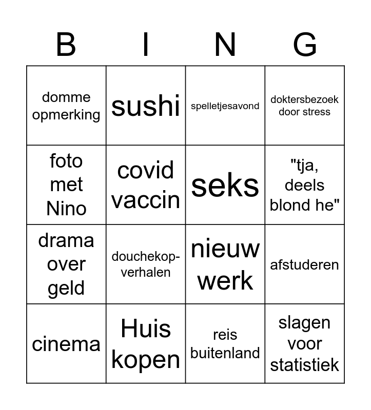 This bingo card has 16 words: Huis kopen, afstuderen, spelletjesavond, domme opmerking, drama over geld, sushi, nieuw werk, reis buitenland, foto met Nino, covid vaccin, cinema, doktersbezoek door stress, douchekop- verhalen, "tja, deels blond he", seks and slagen voor statistiek.