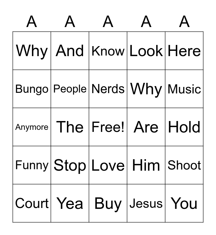 This bingo card has a free space and 33 words: You, I, The, Mute, Funny, People, Here, Court, And, That, Nerds, Know, Gab, Right, Are, Music, Yea, Anymore, Stop, Him, Love, Theory, Why, Hold, Buy, You, Look, Why, Bungo, Shoot, Yo, Jesus and Forgotten.