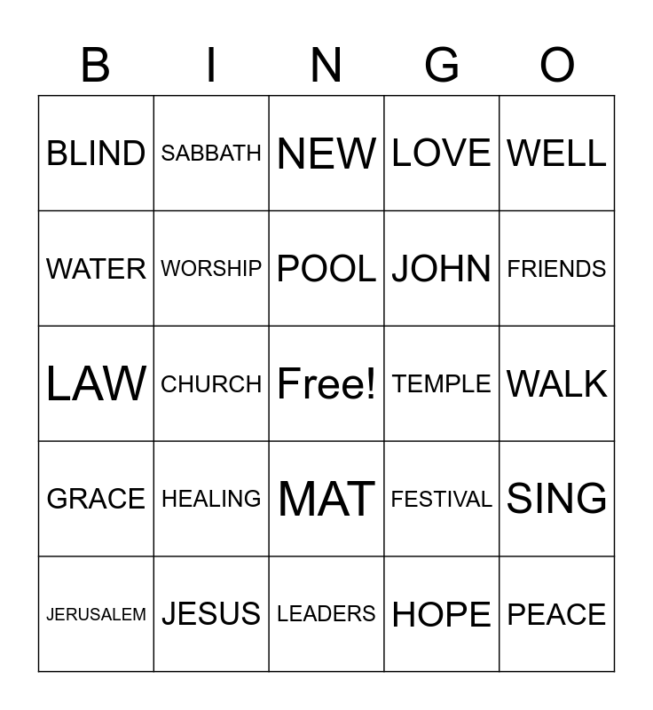 This bingo card has a free space and 24 words: HEALING, JESUS, POOL, JERUSALEM, WELL, BLIND, WATER, SABBATH, TEMPLE, MAT, JOHN, LAW, FESTIVAL, SING, WORSHIP, HOPE, WALK, NEW, FRIENDS, CHURCH, PEACE, GRACE, LOVE and LEADERS.