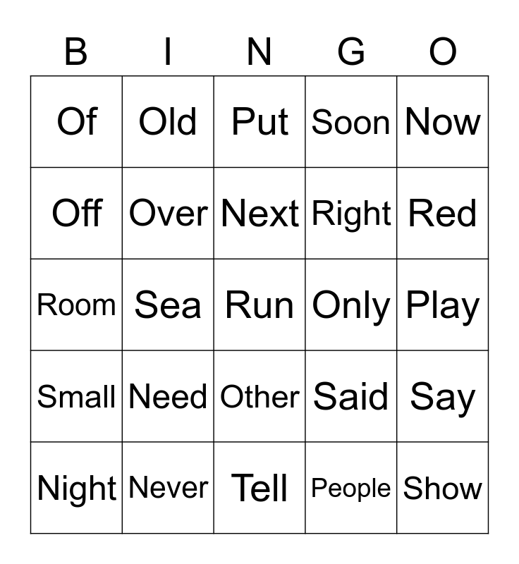 This bingo card has a free space and 24 words: Need, Never, Next, Night, Now, Of, Off, Old, Only, Other, Right, Room, Said, Say, Over, People, Play, Put, Red, Sea, Show, Small, Soon and Tell.