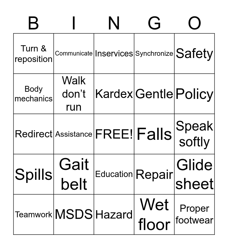 This bingo card has a free space and 24 words: Gait belt, MSDS, Kardex, Teamwork, Safety, Turn & reposition, Body mechanics, Communicate, Falls, Education, Gentle, Redirect, Repair, Glide sheet, Walk don’t run, Wet floor, Speak softly, Inservices, Policy, Assistance, Proper footwear, Spills, Synchronize and Hazard.