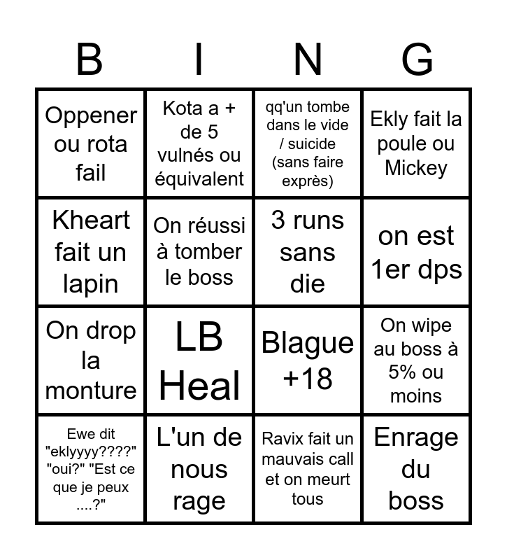 This bingo card has 16 words: Ewe dit "eklyyyy????" "oui?" "Est ce que je peux ....?", L'un de nous rage, qq'un tombe dans le vide / suicide (sans faire exprès), Ekly fait la poule ou Mickey, Kheart fait un lapin, Kota a + de 5 vulnés ou équivalent, Blague +18, On wipe au boss à 5% ou moins, Oppener ou rota fail, On réussi à tomber le boss, Ravix fait un mauvais call et on meurt tous, on est 1er dps, On drop la monture, LB Heal, 3 runs sans die and Enrage du boss.