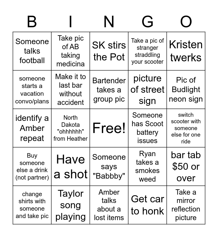 This bingo card has a free space and 24 words: Have a shot, Taylor song playing, Bartender takes a group pic, change shirts with someone and take pic, Kristen twerks, Someone talks football, someone starts a vacation convo/plans, Take pic of AB taking medicina, Someone has Scoot battery issues, Someone says "Babbby", picture of street sign, identify a Amber repeat, Ryan takes a smokes weed, bar tab $50 or over, Make it to last bar without accident, Get car to honk, switch scooter with someone else for one ride, SK stirs the Pot, Pic of Budlight neon sign, North Dakota "ohhhhhh" from Heather, Take a mirror reflection picture, Buy someone else a drink (not partner), Take a pic of stranger straddling your scooter and Amber talks about a lost items.