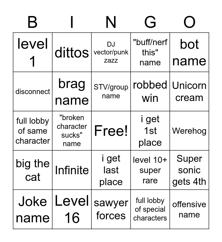 This bingo card has a free space and 24 words: Infinite, Level 16, STV/group name, Joke name, bot name, level 1, disconnect, dittos, i get 1st place, i get last place, robbed win, full lobby of same character, level 10+ super rare, Super sonic gets 4th, brag name, full lobby of special characters, Werehog, DJ vector/punk zazz, Unicorn cream, "broken character sucks" name, offensive name, big the cat, "buff/nerf this" name and sawyer forces.